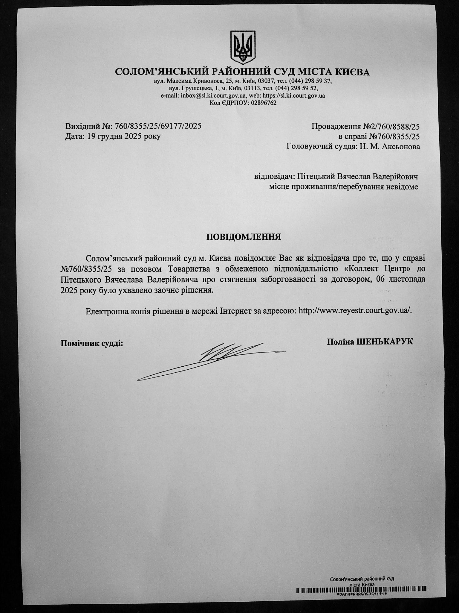 Оголошення про виклик до суду про справі 760/8355/25 Пітецький В.В.