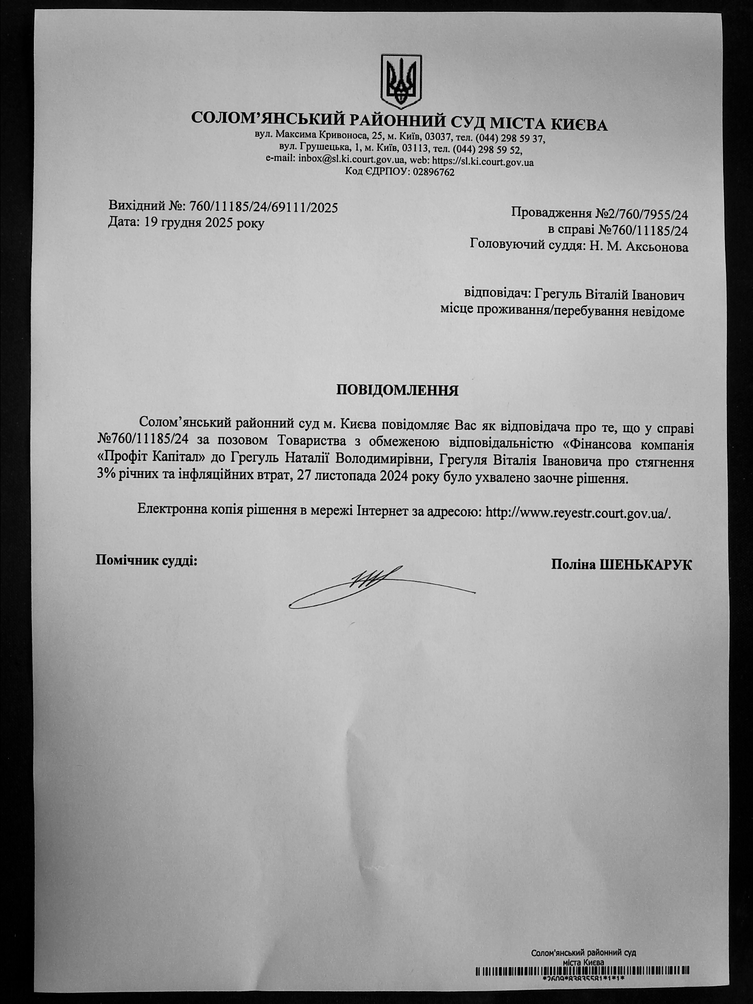 Оголошення про виклик до суду про справі 760/11185/24 Грегуль В.І.