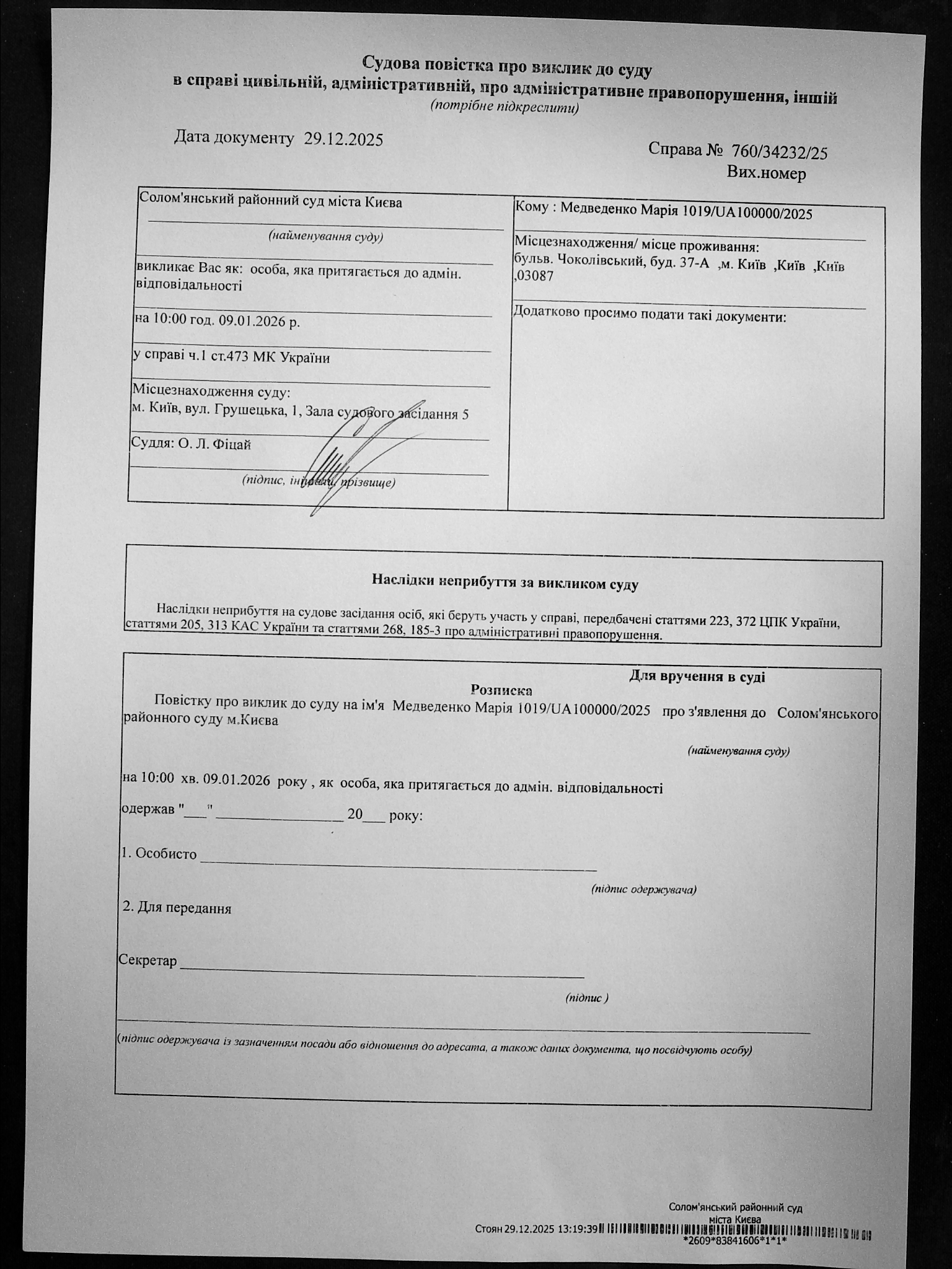 Оголошення про виклик до суду про справі 760/34232/25 Медведенко Марія