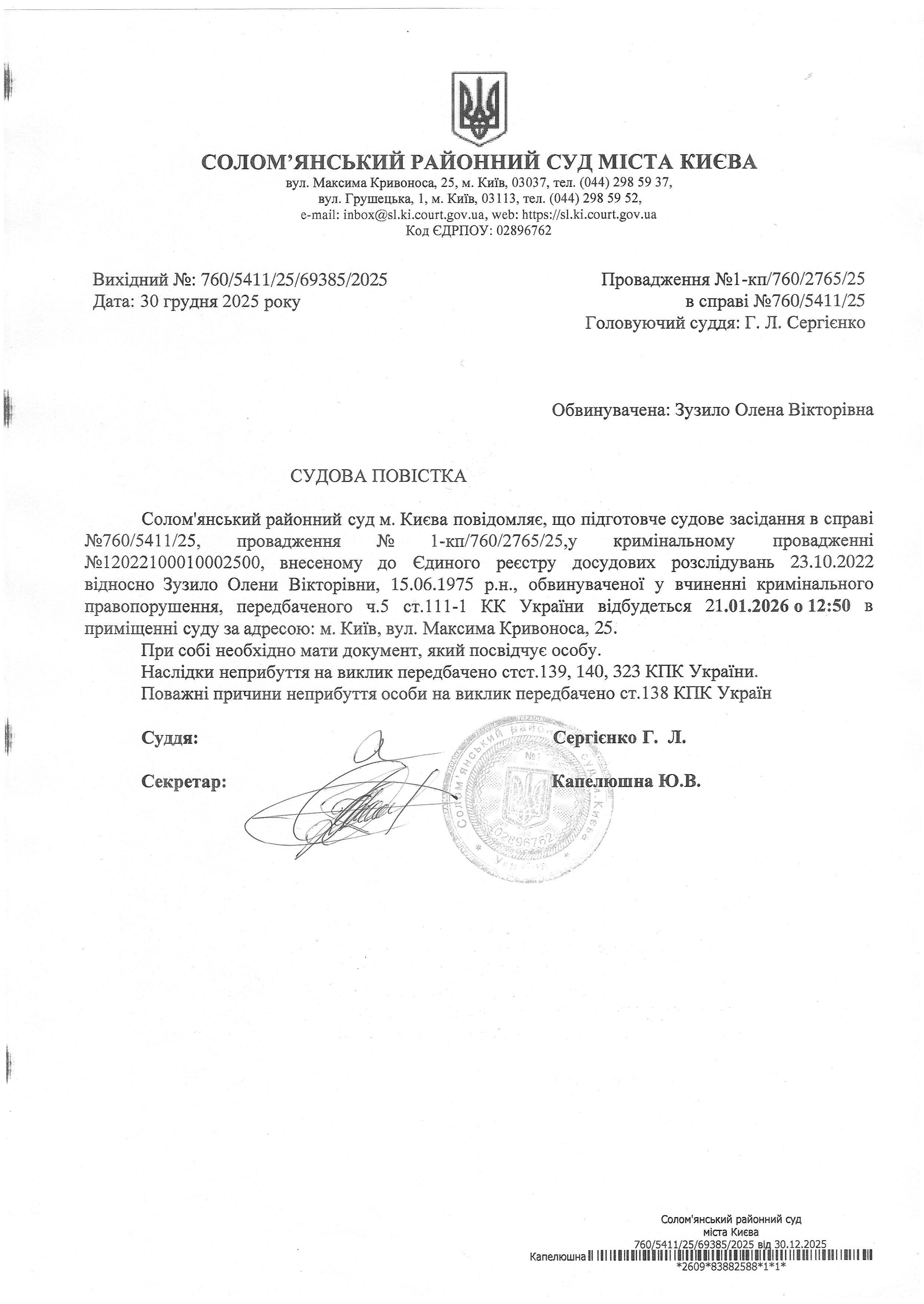 Оголошення про виклик до суду про справі 760/5411/25 Зузило О.В.