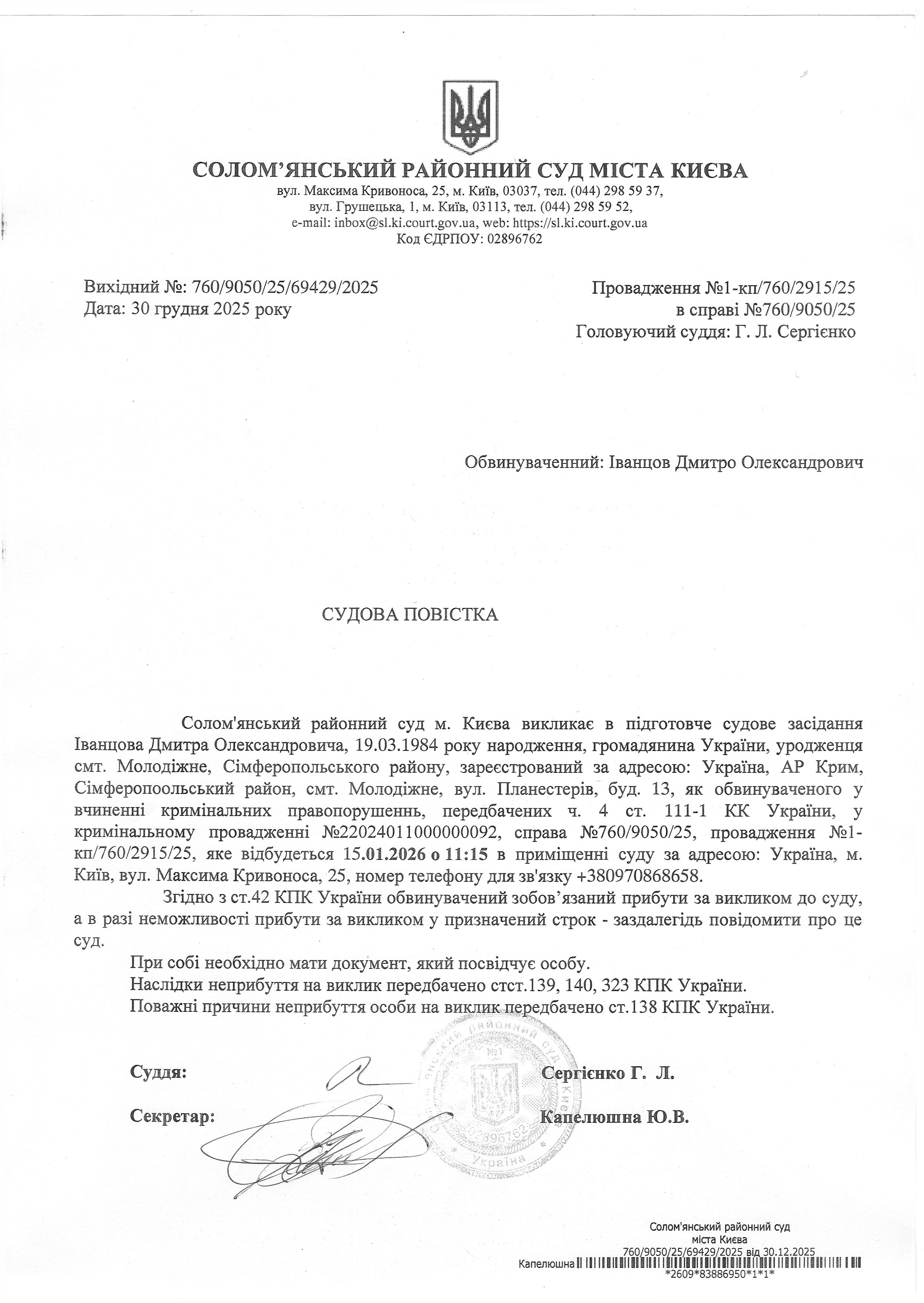 Оголошення про виклик до суду про справі 760/9050/25 Іванцов Д.О.