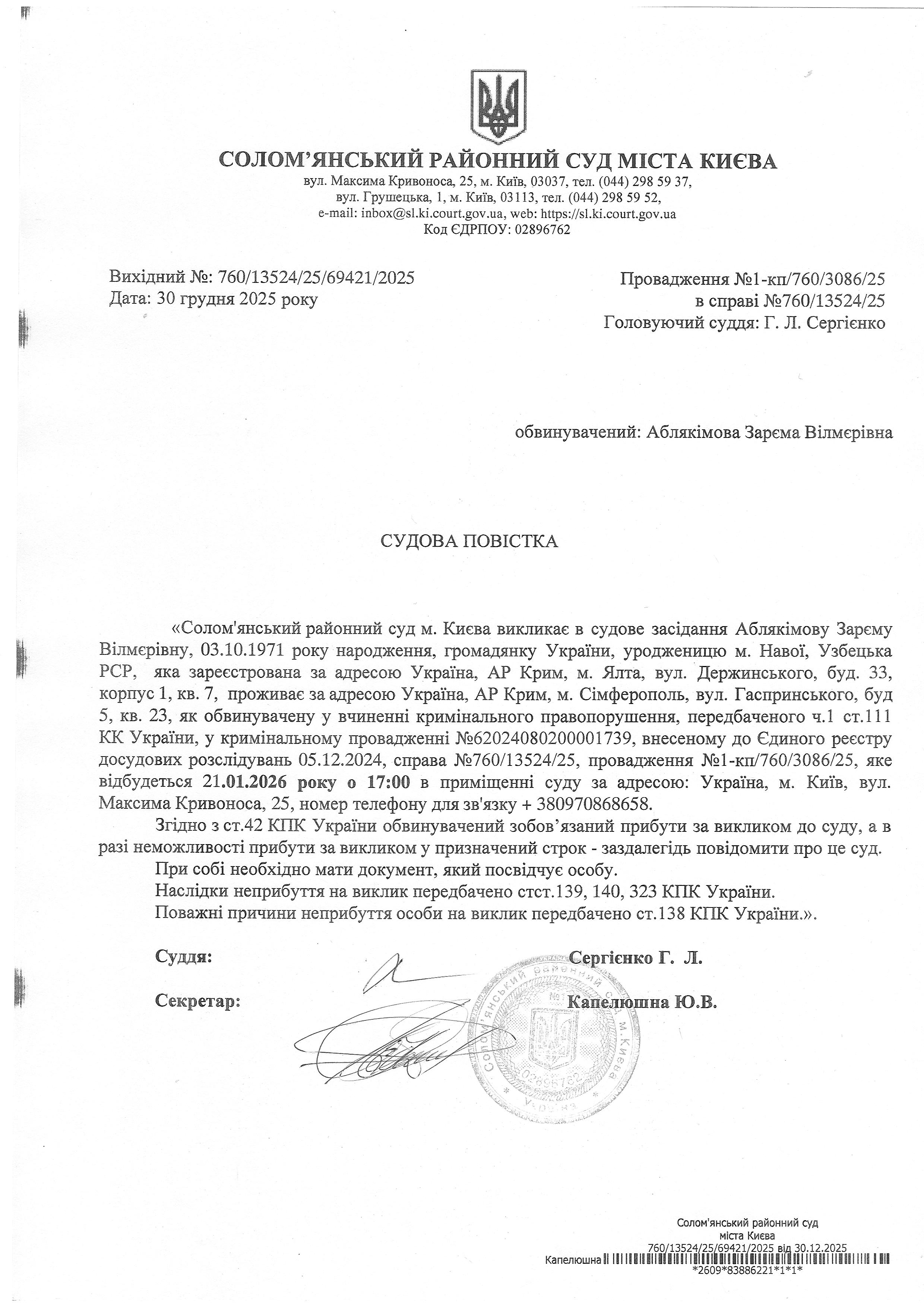 Оголошення про виклик до суду про справі 760/13524/25 Аблякімова З.В.
