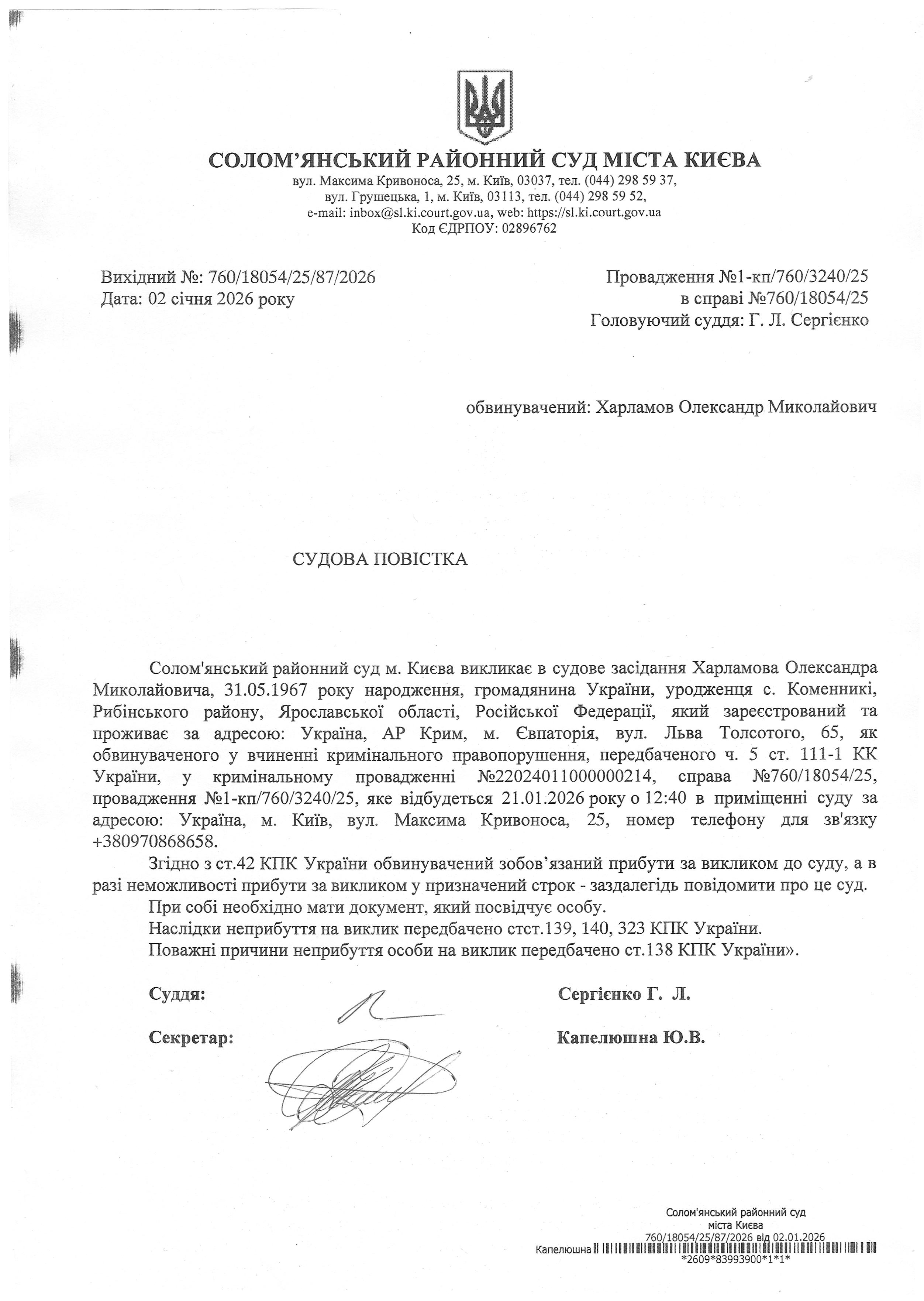 Оголошення про виклик до суду про справі 760/18054/25 Харламов О.М.