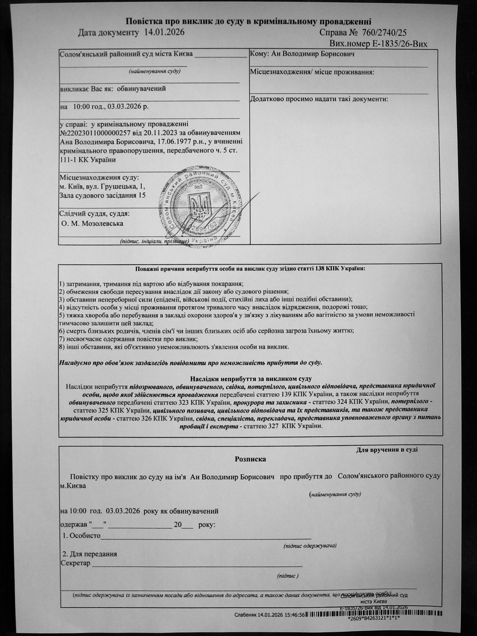 Оголошення про виклик до суду про справі 760/2740/25 Ан В.Б.
