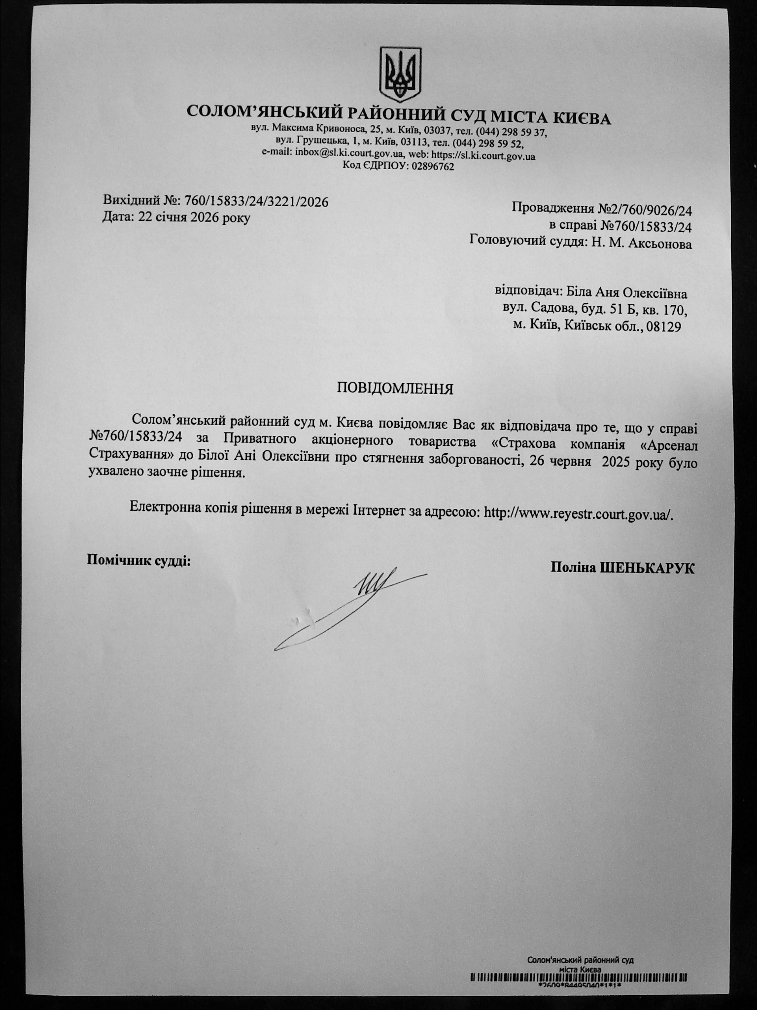 Оголошення про виклик до суду про справі 760/15833/24 Біла А.О.