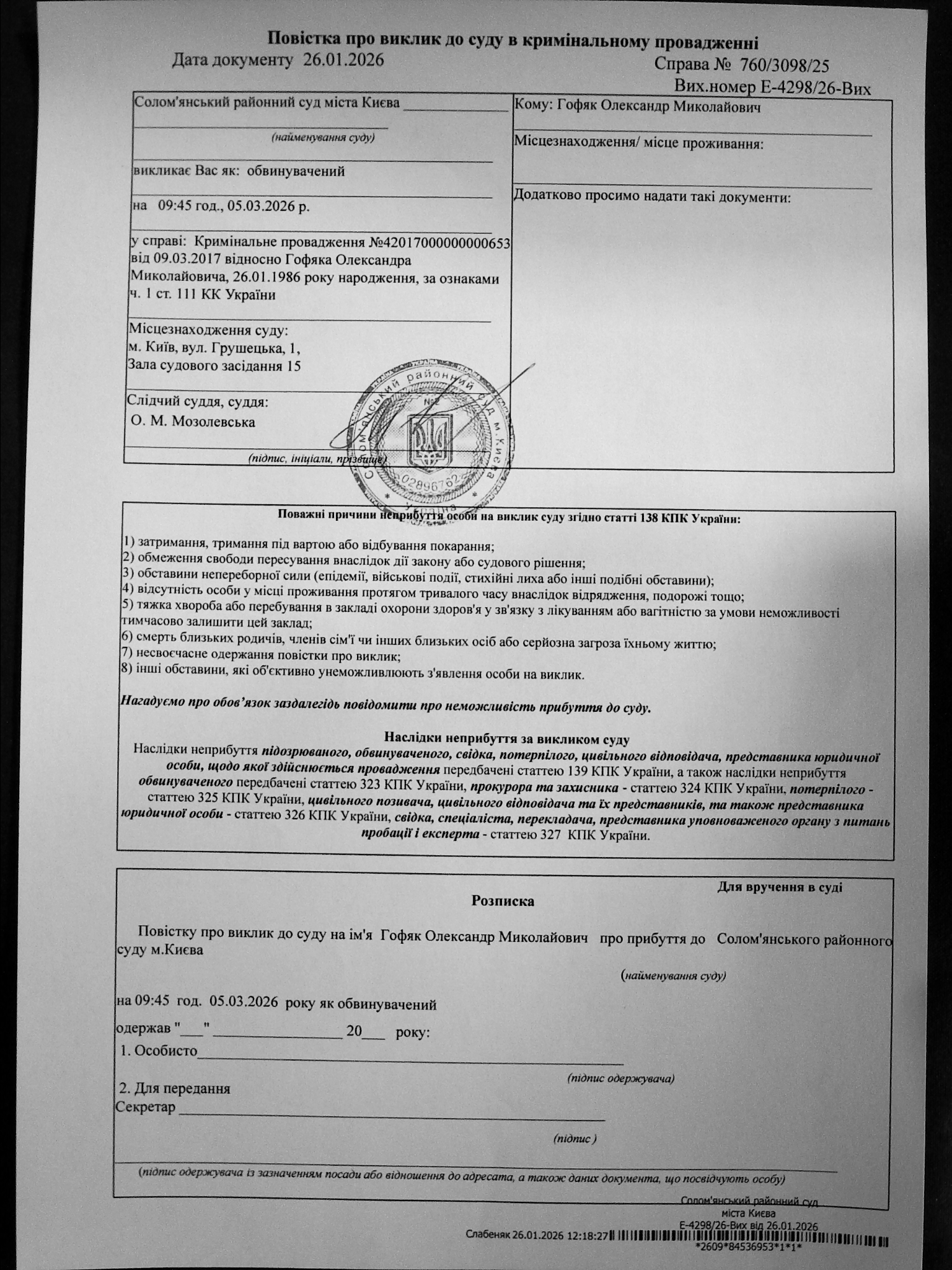 Оголошення про виклик до суду про справі 760/3098/25 Гофяк О.М.
