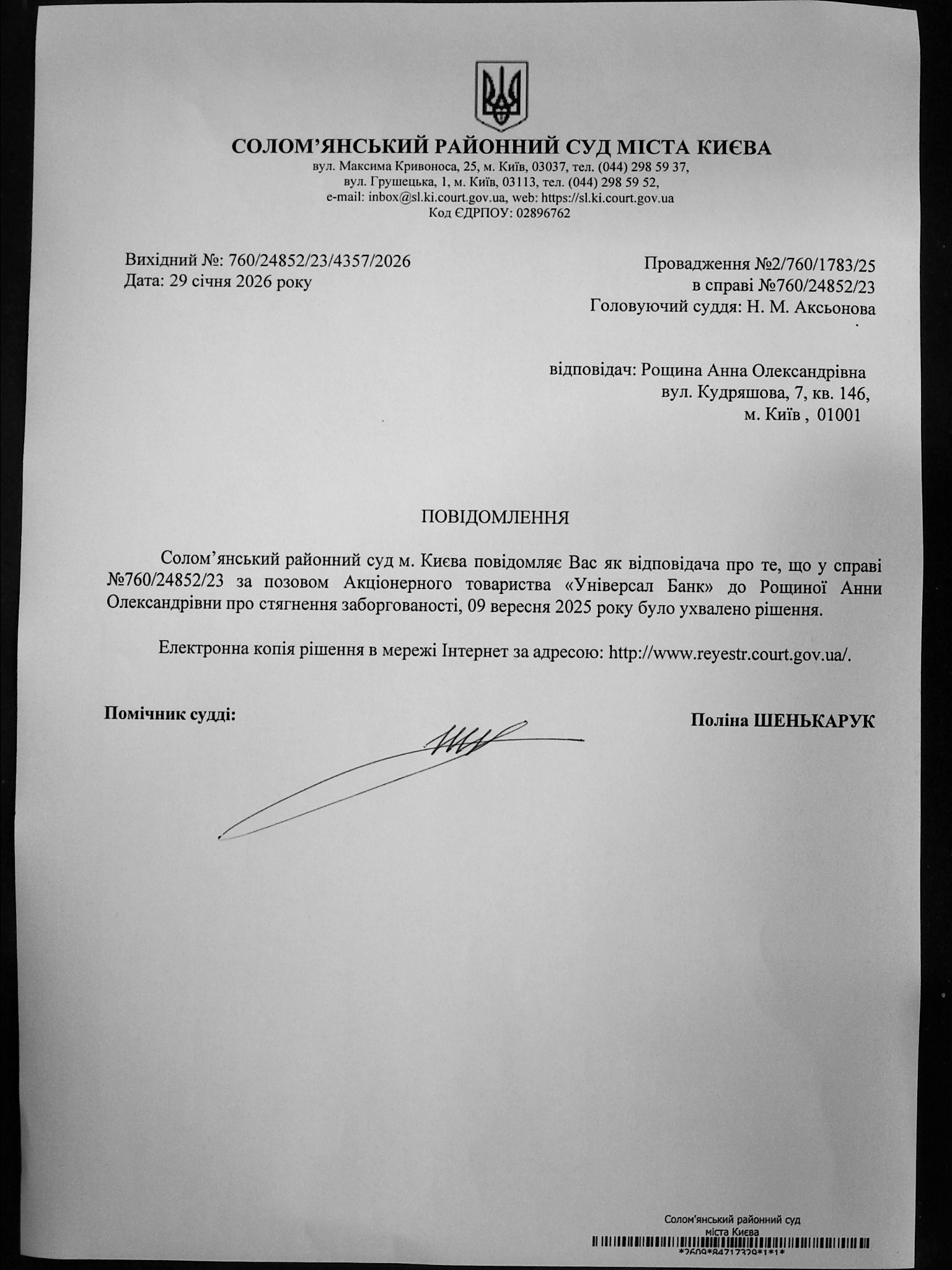Оголошення про виклик до суду про справі 760/24852/23 Рощина А.О.