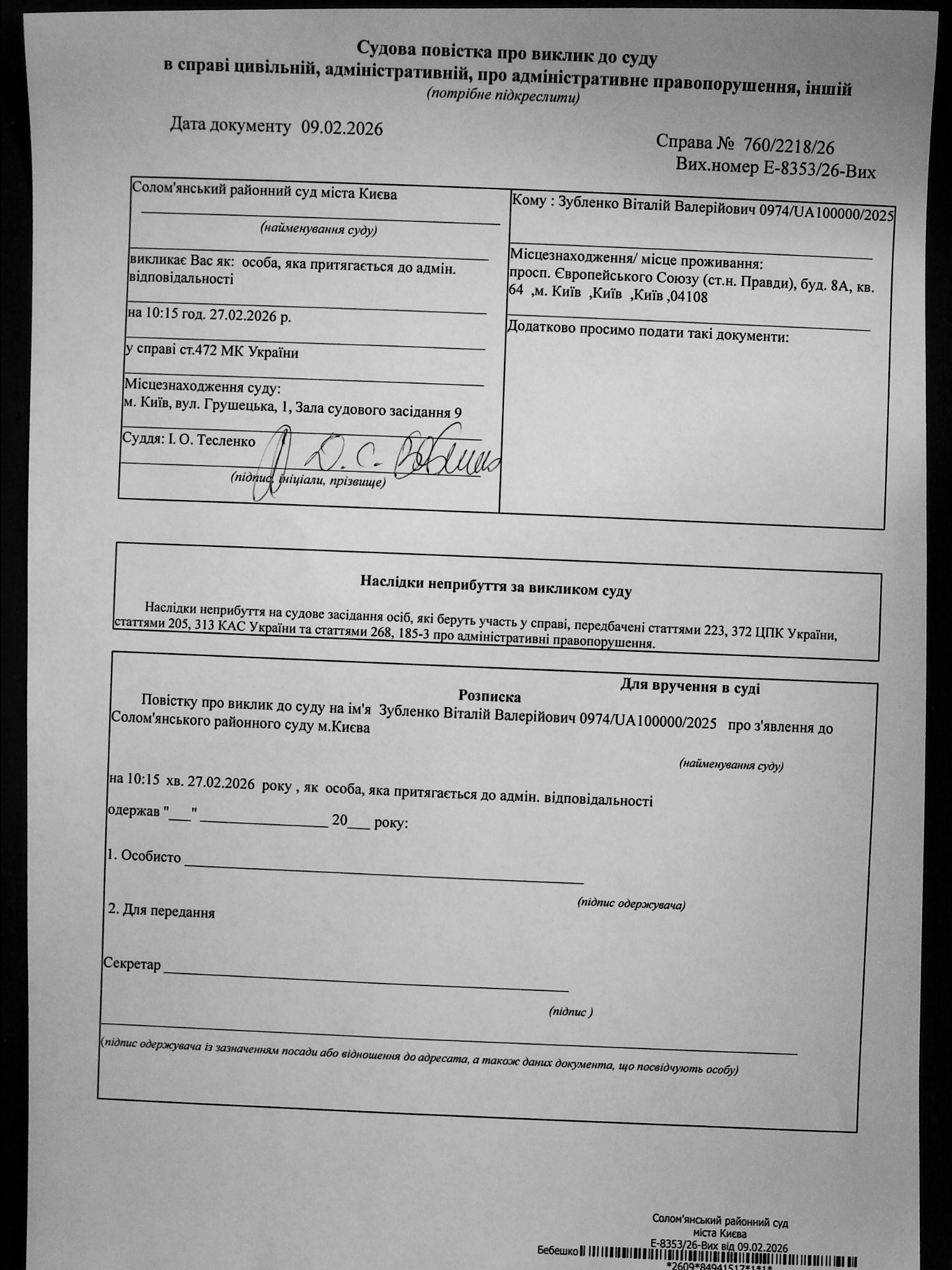Оголошення про виклик до суду про справі 760/2218/26 Зубленко В.В.