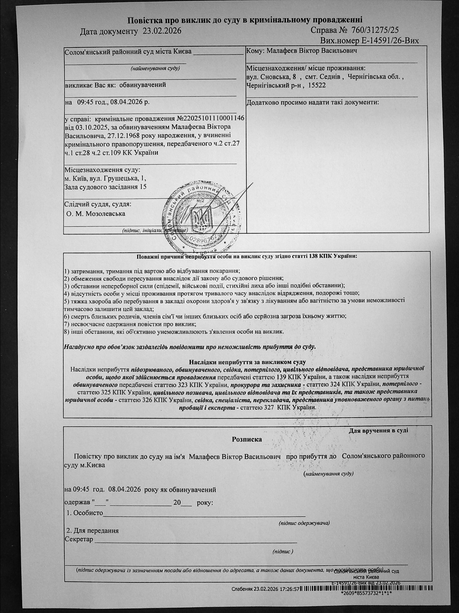 Оголошення про виклик до суду про справі 760/31275/25 Малафеєв В.В.