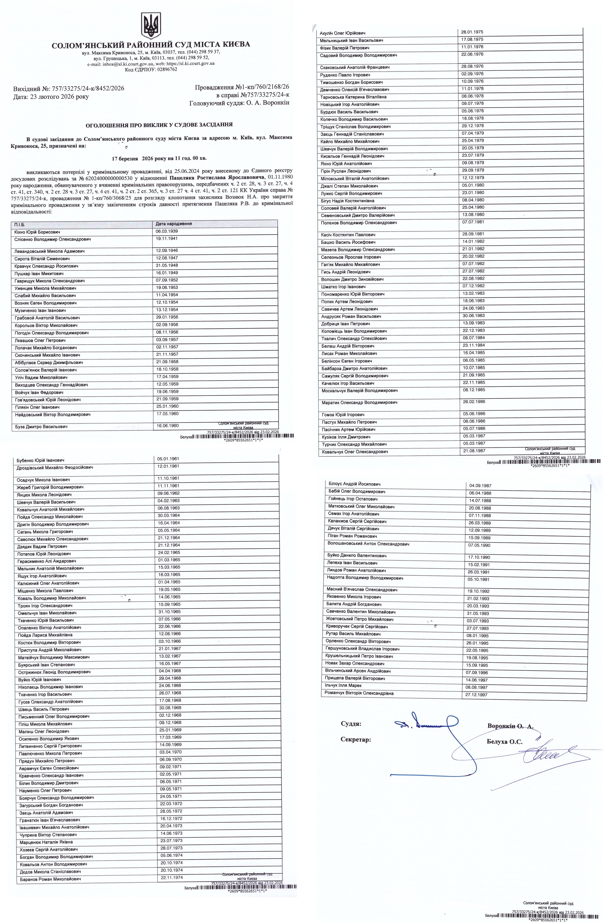 Оголошення про виклик до суду про справі 757/33275/24-к Пацеляк Р.Я.