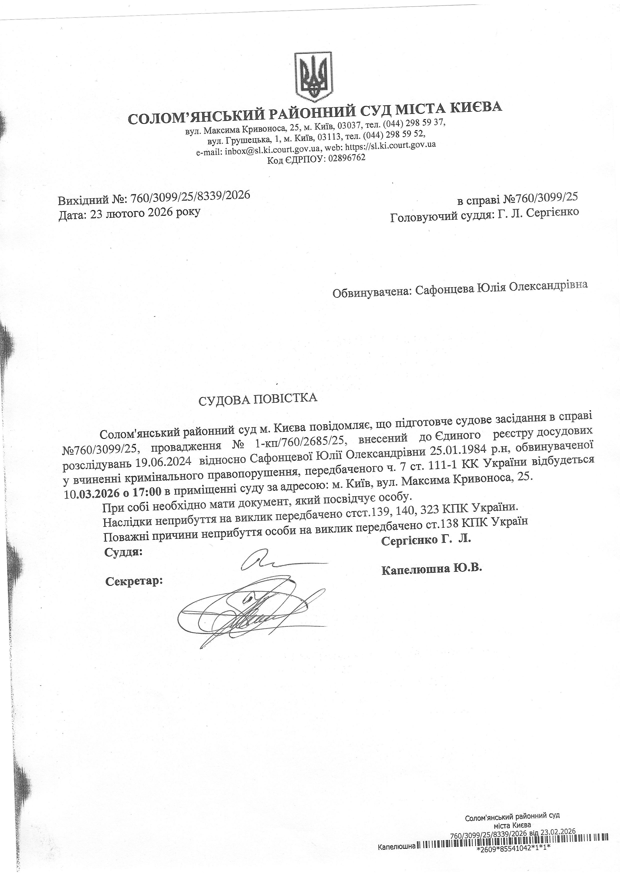 Оголошення про виклик до суду про справі 760/3099/25 Сафонцева Ю.О.