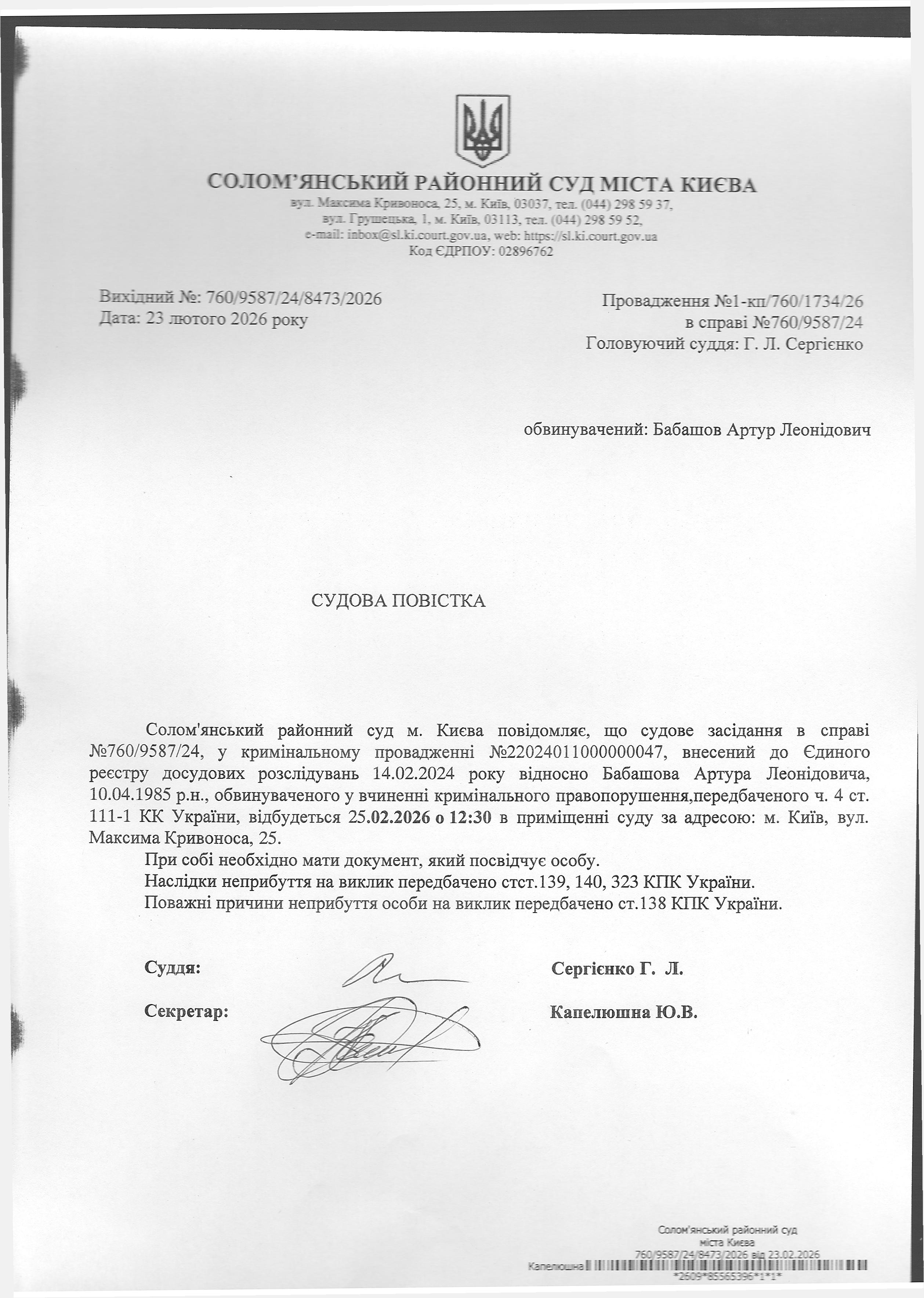 Оголошення про виклик до суду про справі 760/9587/24 Бабашов А.Л.