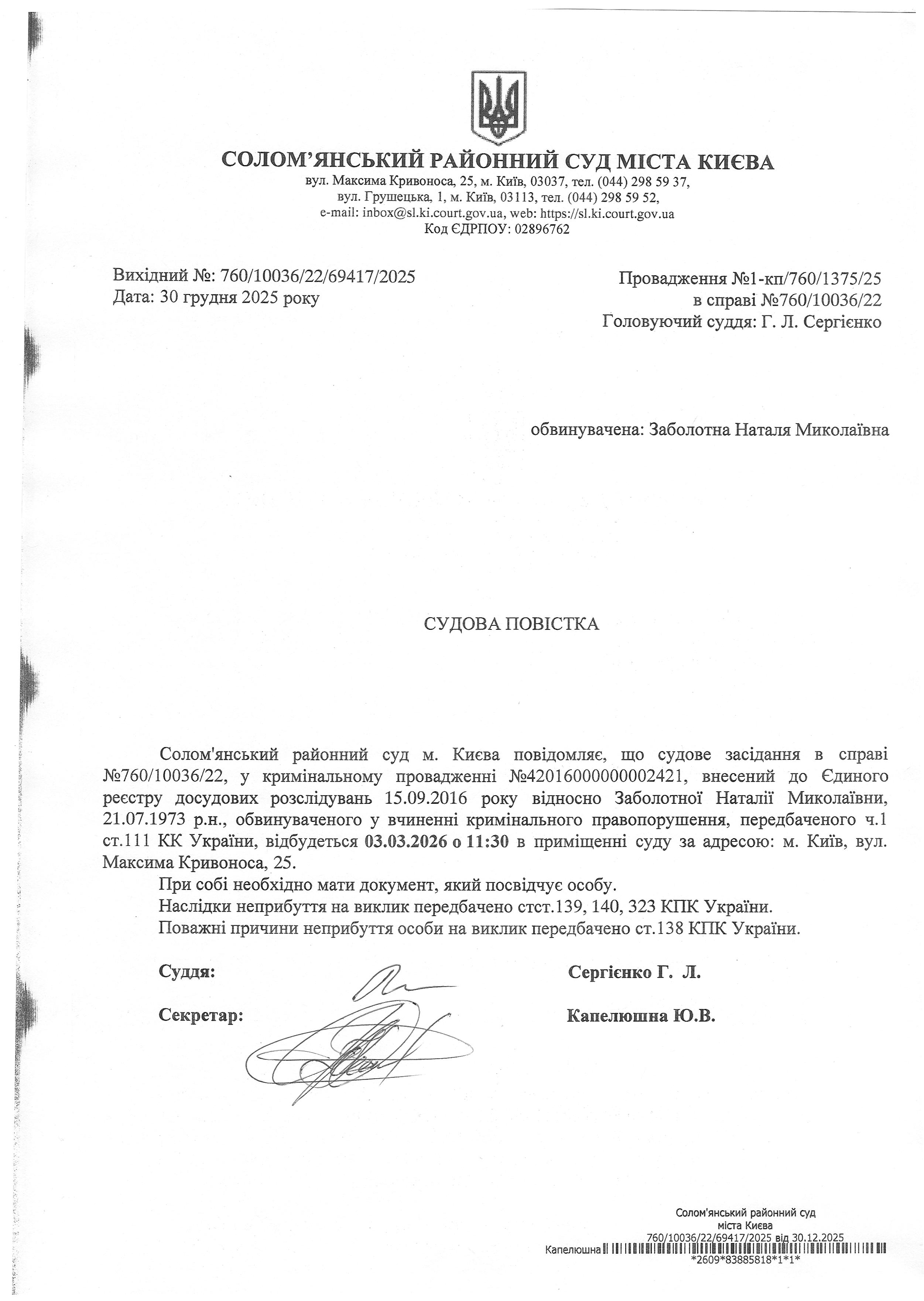 Оголошення про виклик до суду про справі 760/10036/22 Заболотна Н.М.