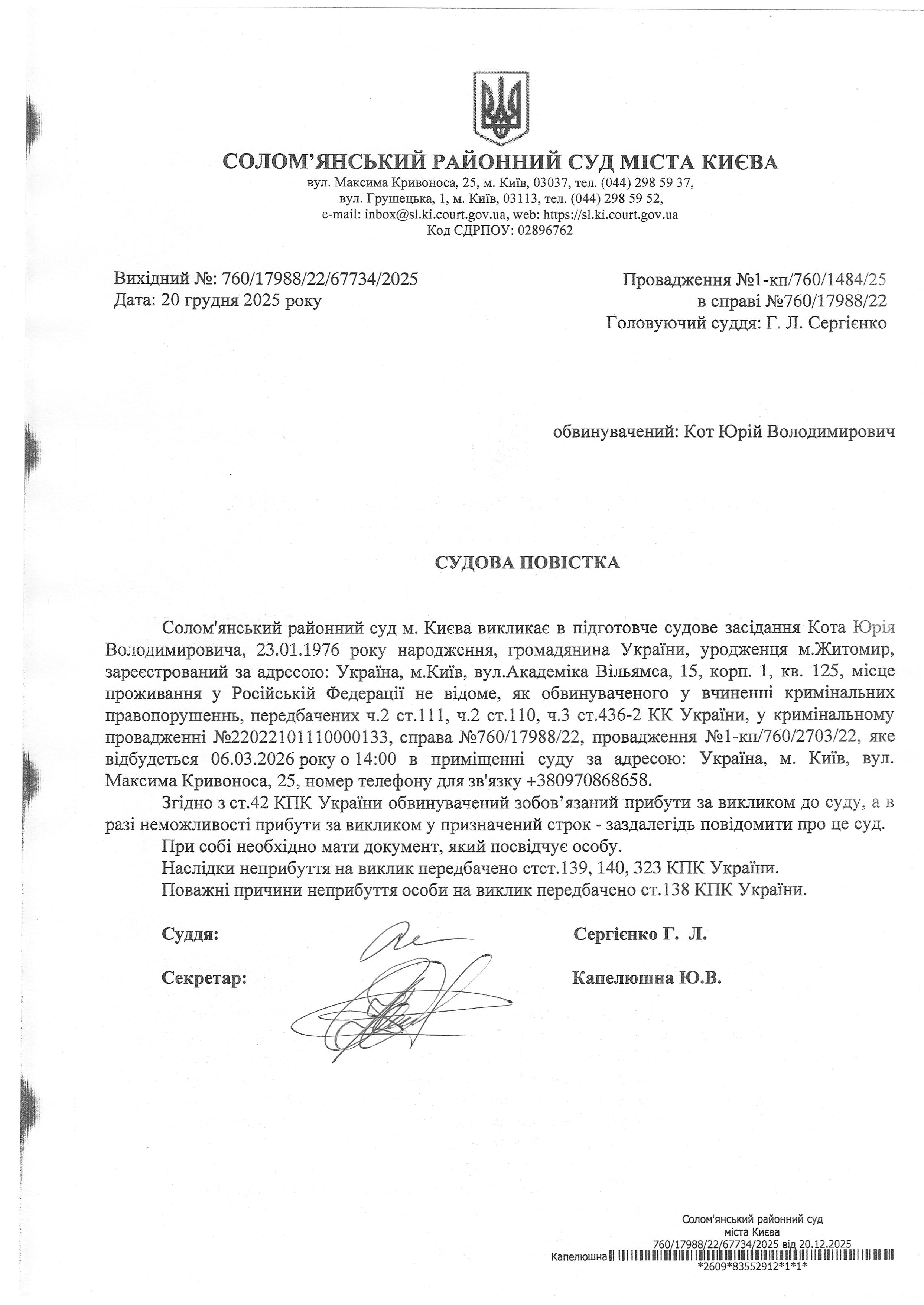 Оголошення про виклик до суду про справі 760/17988/22 Кот Ю.В.