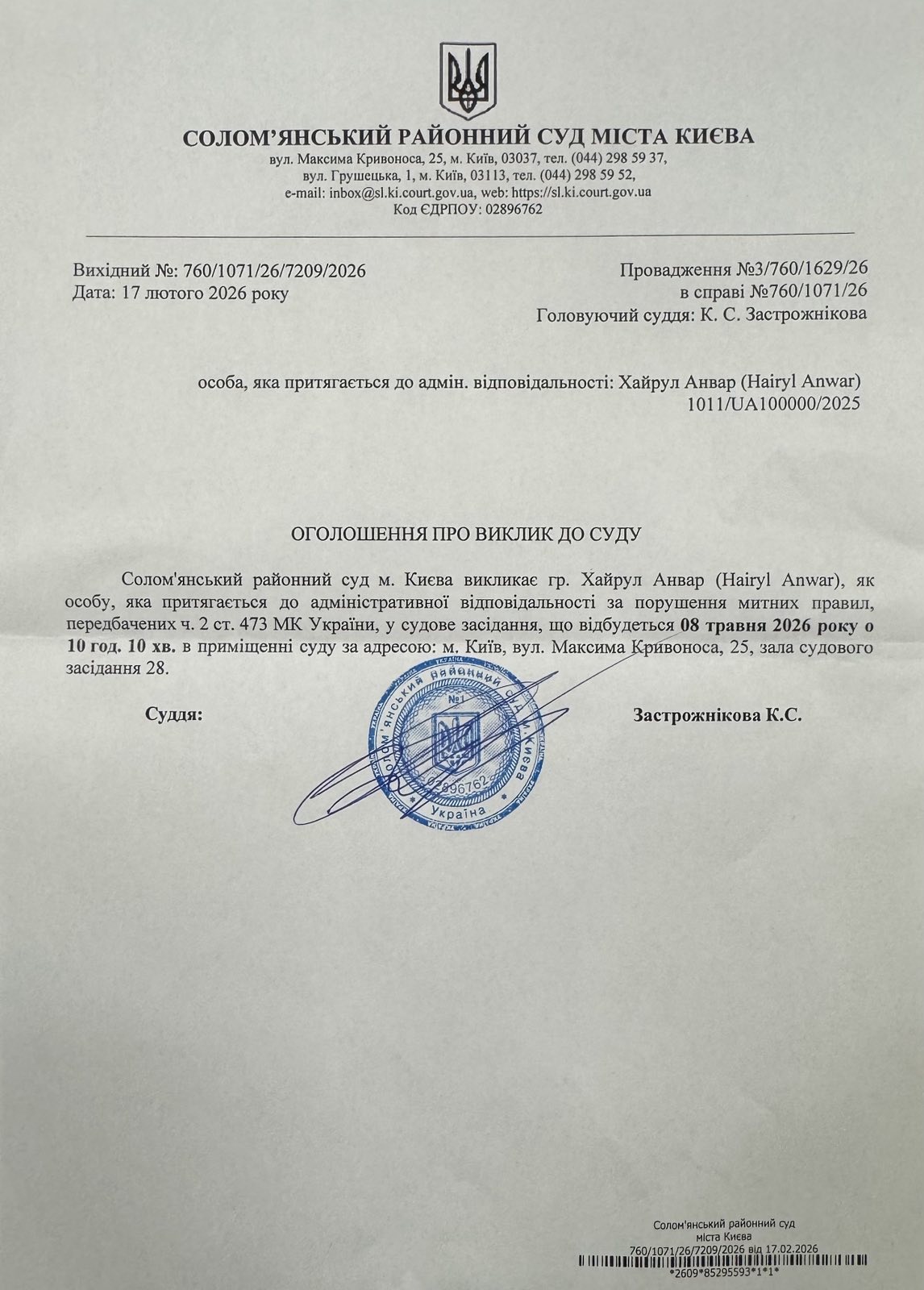 Оголошення про виклик до суду про справі 760/1071/26 Хайрул Анвар