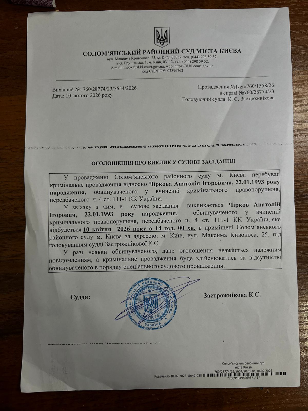 Оголошення про виклик до суду про справі 760/28774/23 Чірков А.І.