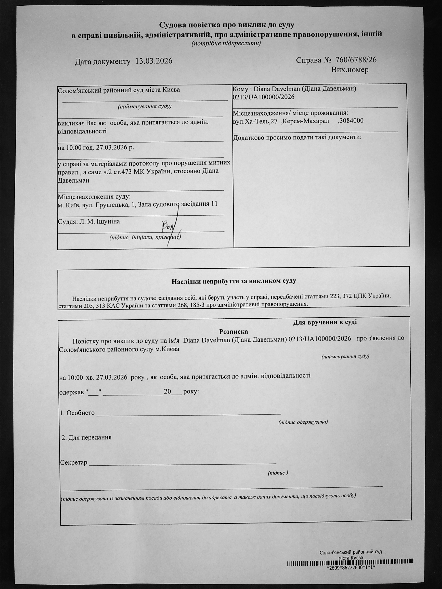 Оголошення про виклик до суду про справі 760/6788/26 Діана Давельман