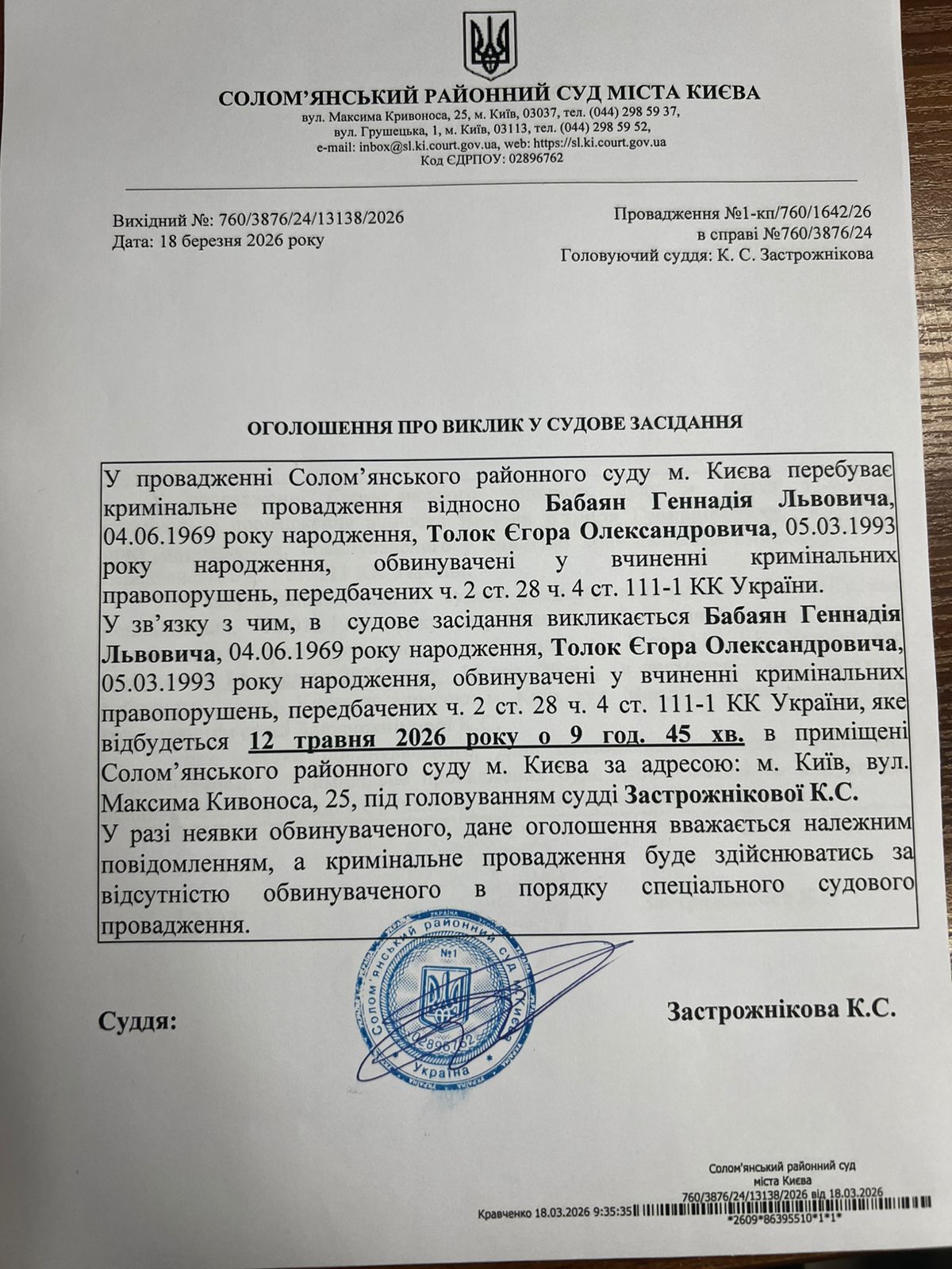 Оголошення про виклик до суду про справі 760/3876/24 Бабаян Г.Л.