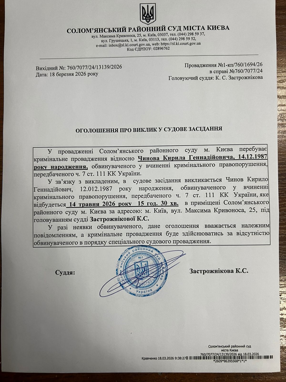 Оголошення про виклик до суду про справі 760/7077/24 Чинов К.Г.