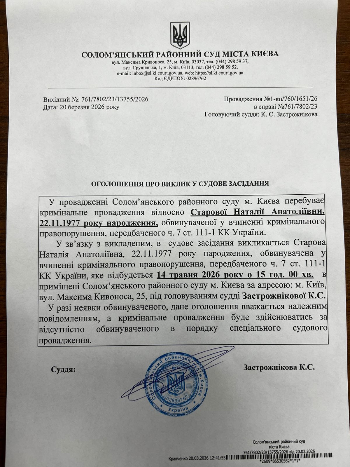 Оголошення про виклик до суду про справі 761/7802/23 Старова Н.А.