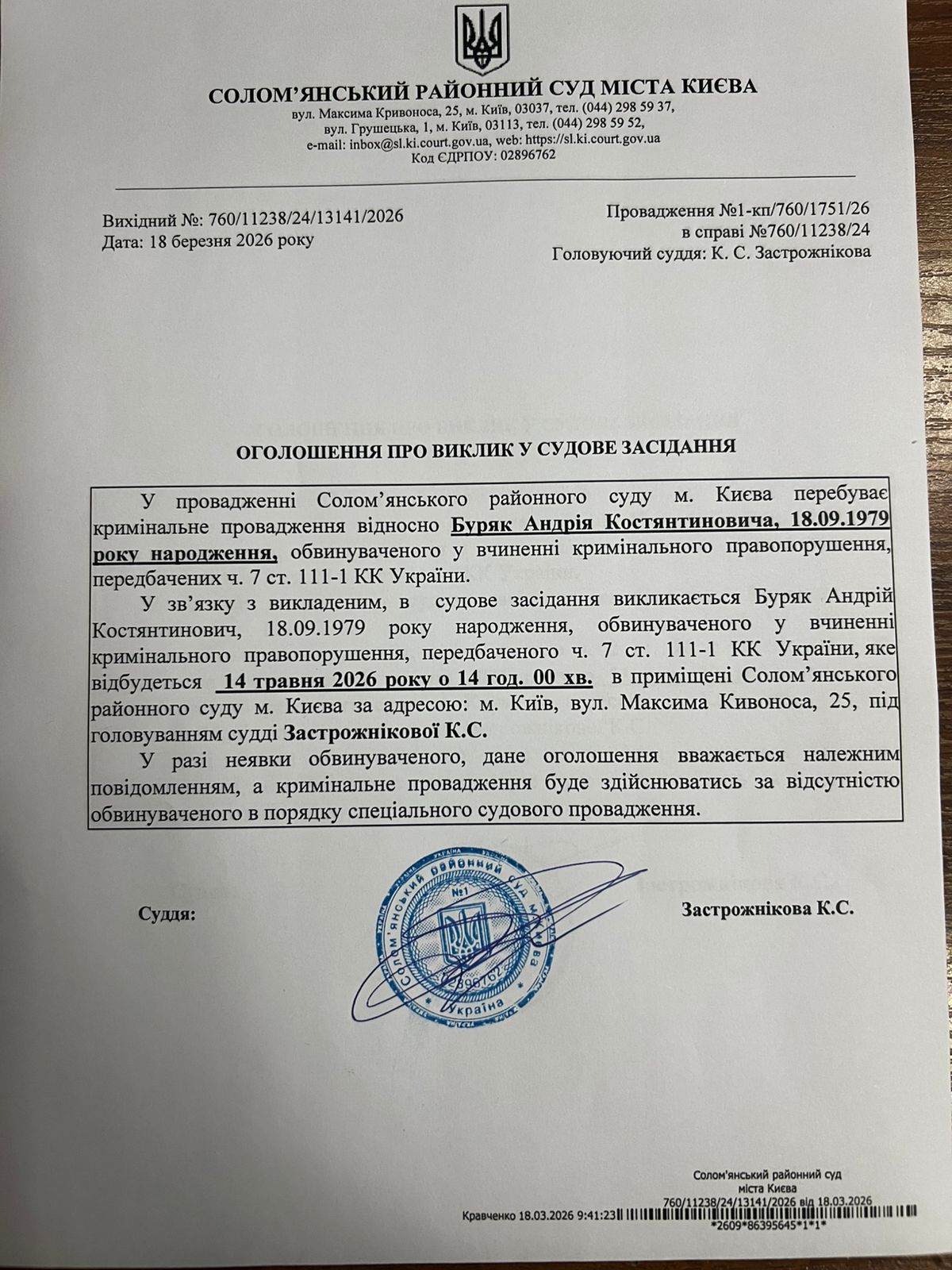 Оголошення про виклик до суду про справі 760/11238/24 Буряк А.К.