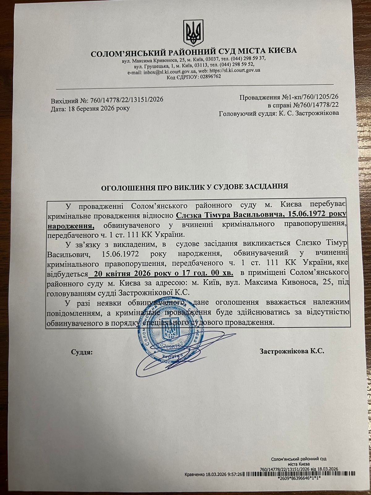 Оголошення про виклик до суду про справі 760/14778/22 Слєзко Т.В.
