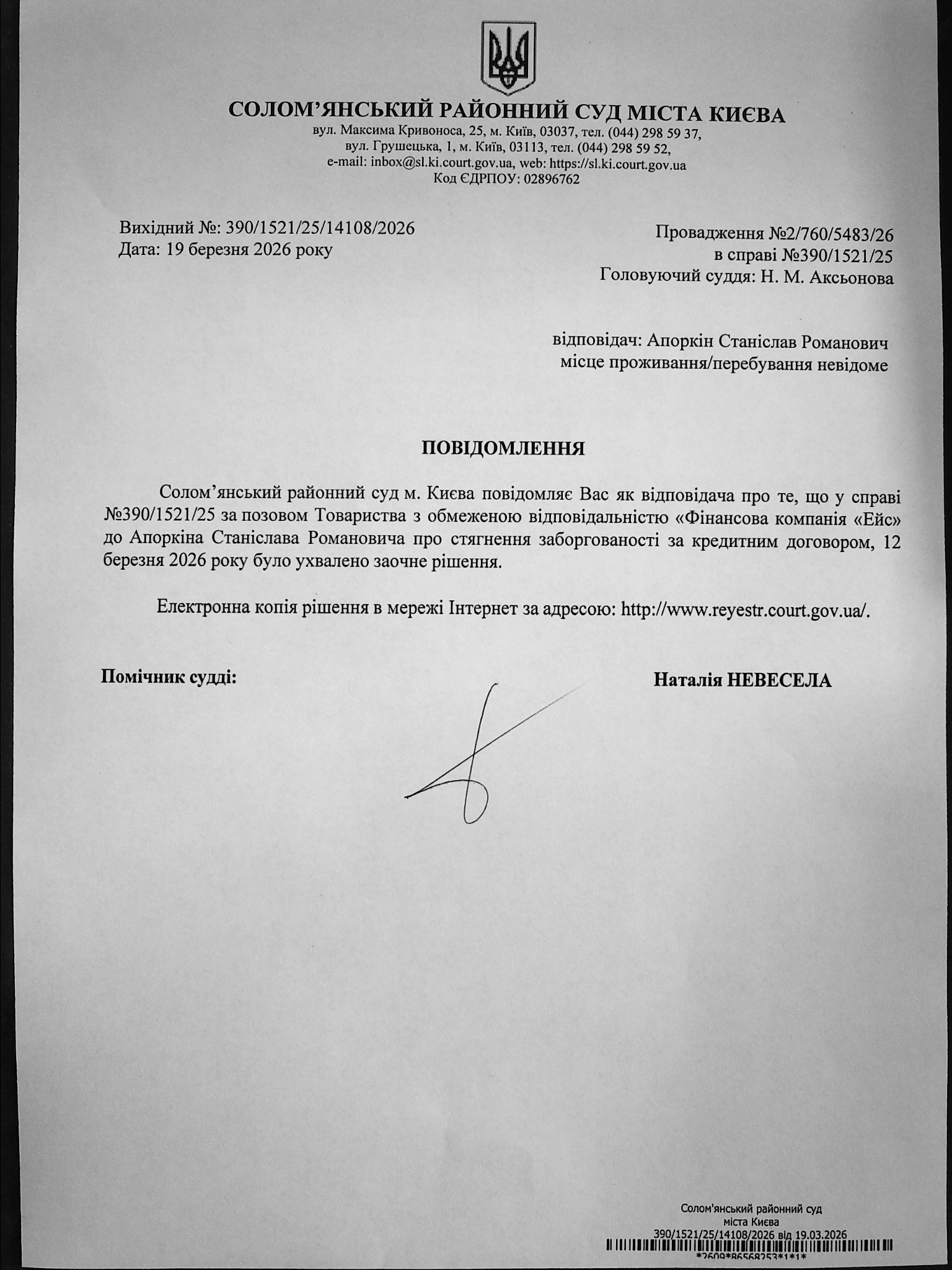 Оголошення про виклик до суду про справі 390/1521/25 Апоркін С.Р.