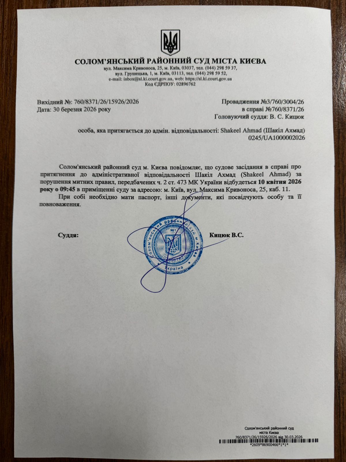 Оголошення про виклик до суду про справі 760/8371/26 Шакіл Ахмад