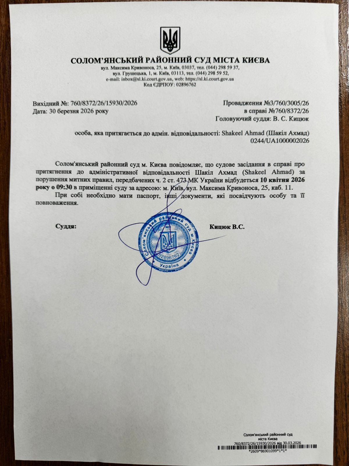 Оголошення про виклик до суду про справі 760/8372/26 Шакіл Ахмад