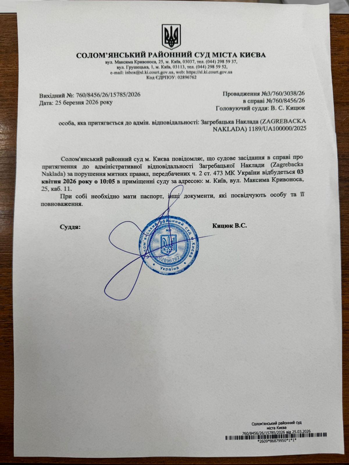 Оголошення про виклик до суду про справі 760/8456/26 Загребацька Наклада