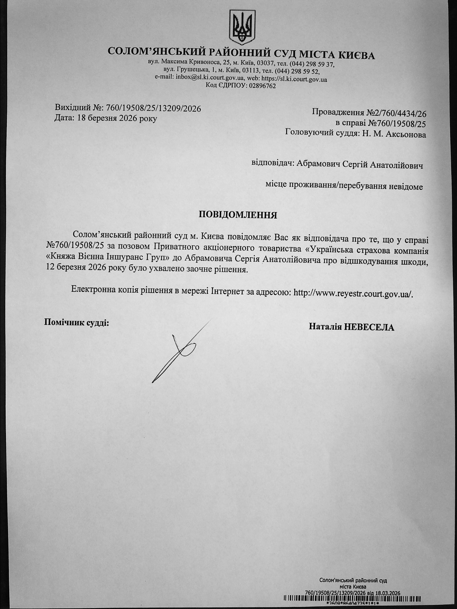 Оголошення про виклик до суду про справі 760/19508/25 Абрамович С.А.
