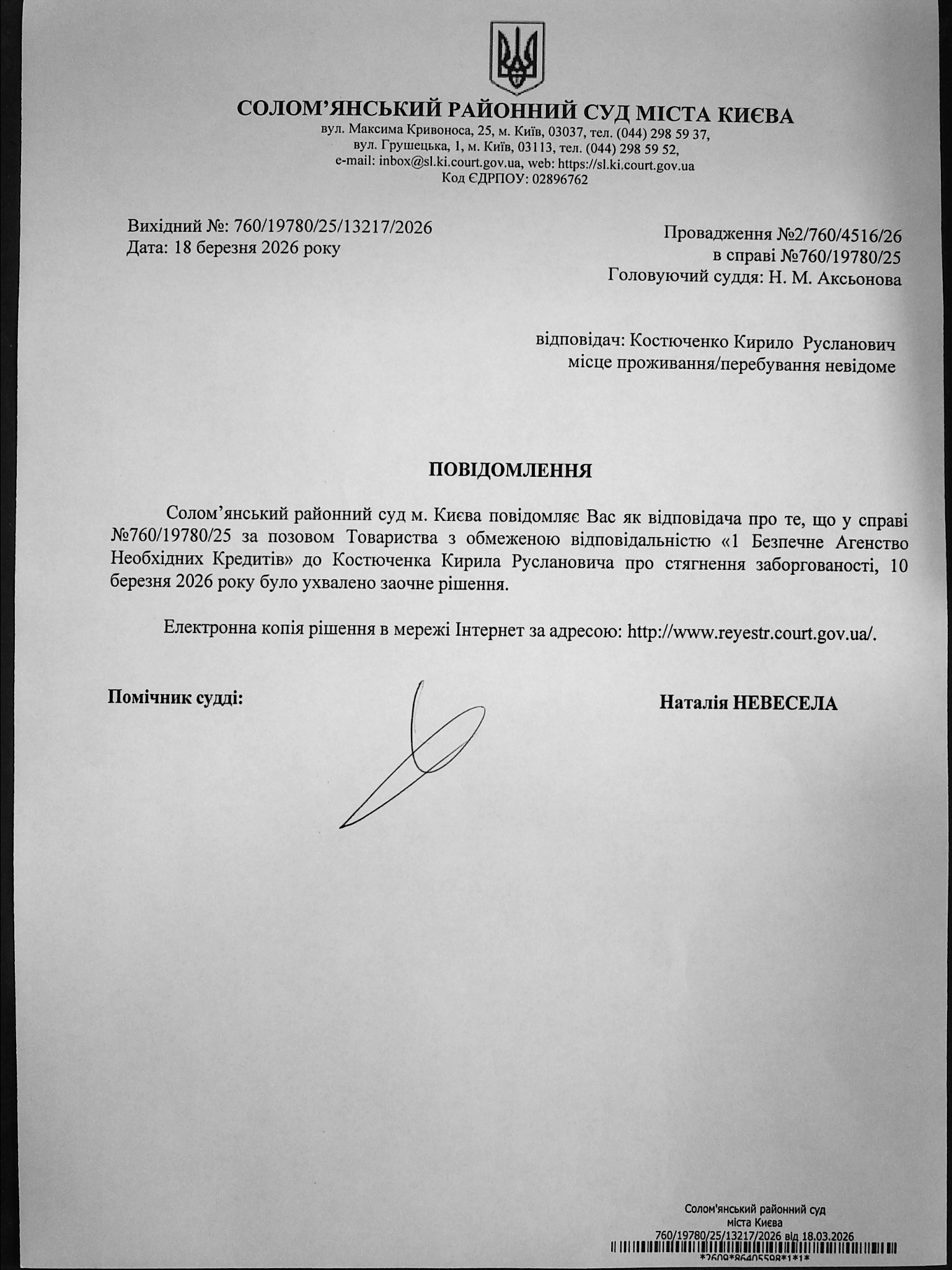 Оголошення про виклик до суду про справі 760/19780/25 Костюченко К.Р.