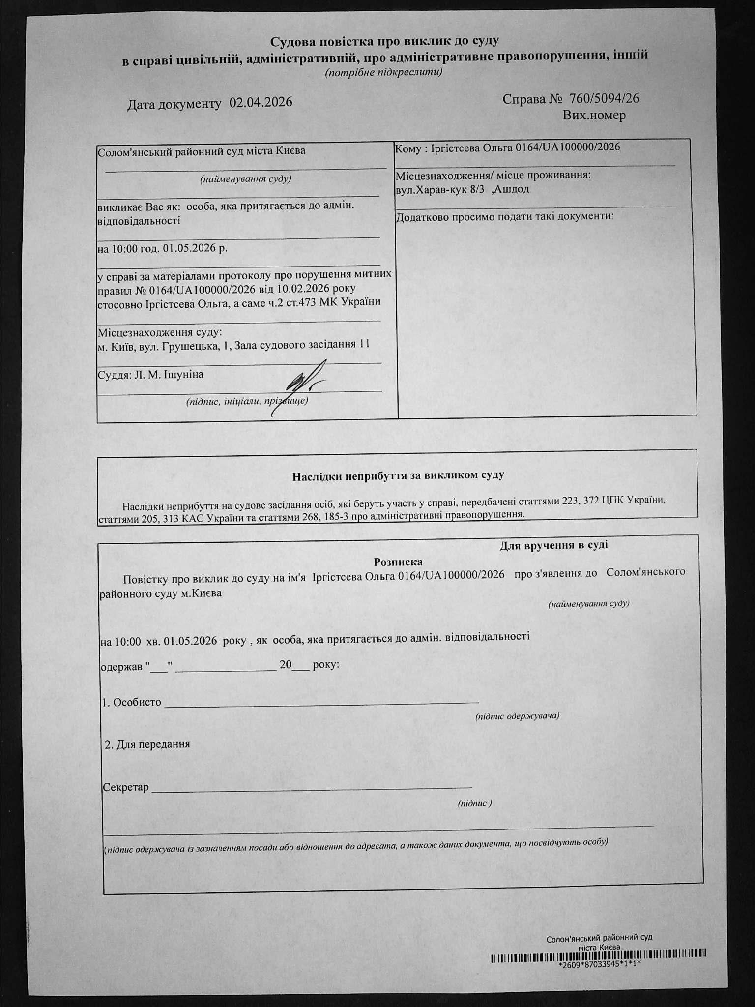 Оголошення про виклик до суду про справі 760/5094/26 Іргістсева Ольга