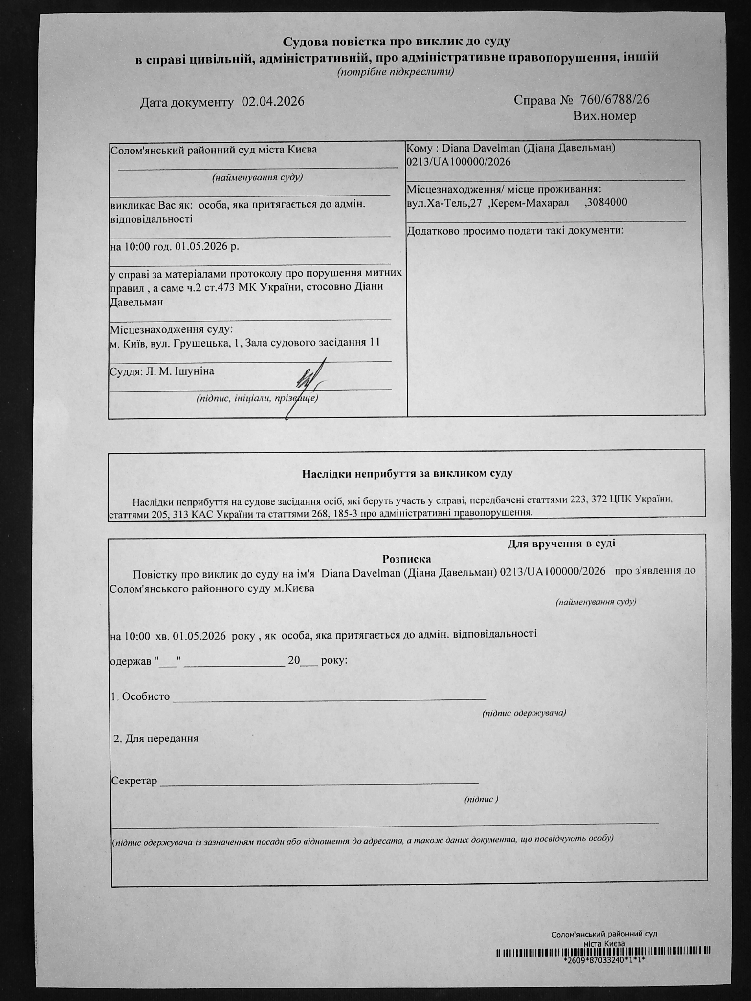 Оголошення про виклик до суду про справі 760/6788/26 Діана Давельман