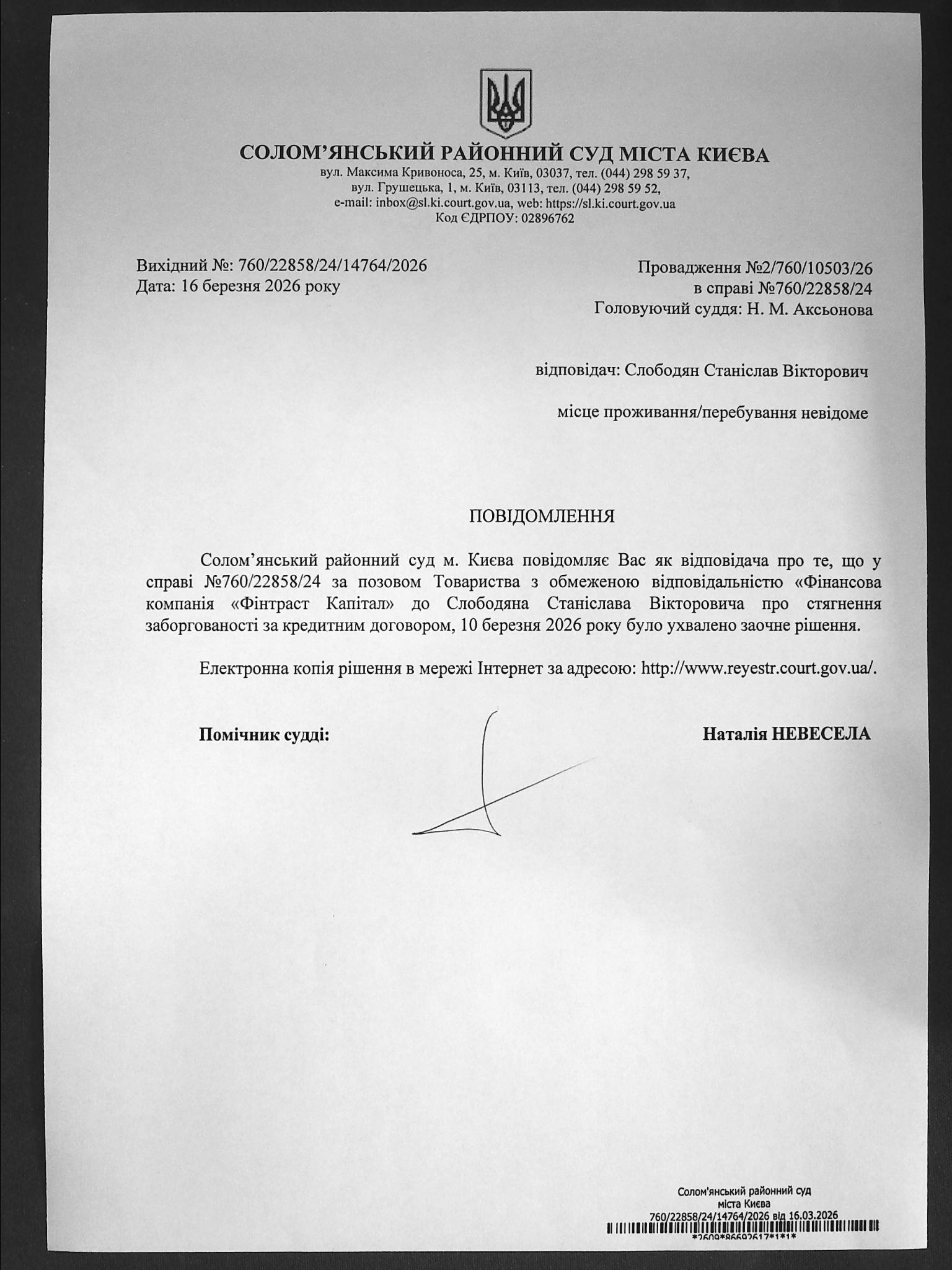 Оголошення про виклик до суду про справі 760/22858/24 Слободян С.В.