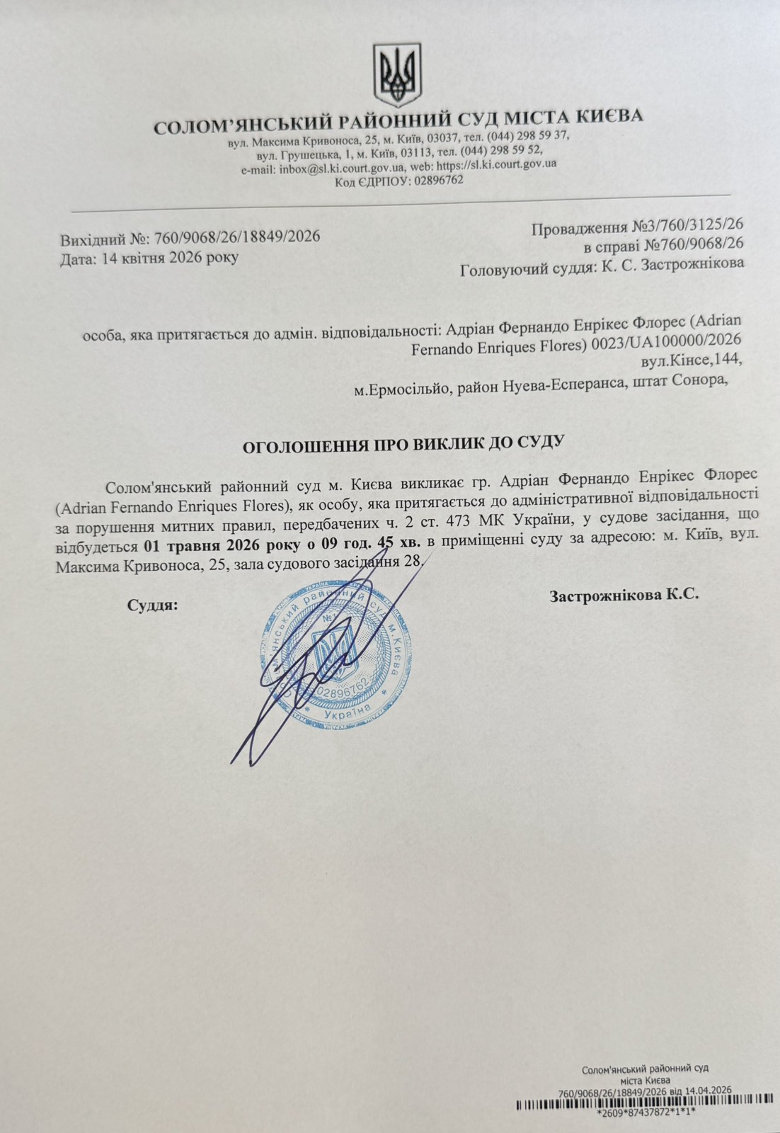 Оголошення про виклик до суду про справі 760/9068/26 Адріан Фернандо