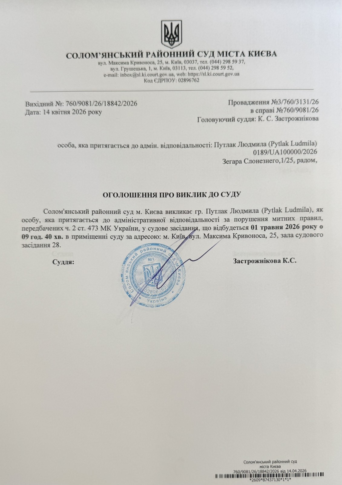 Оголошення про виклик до суду про справі 760/9081/26 Путляк Людмила