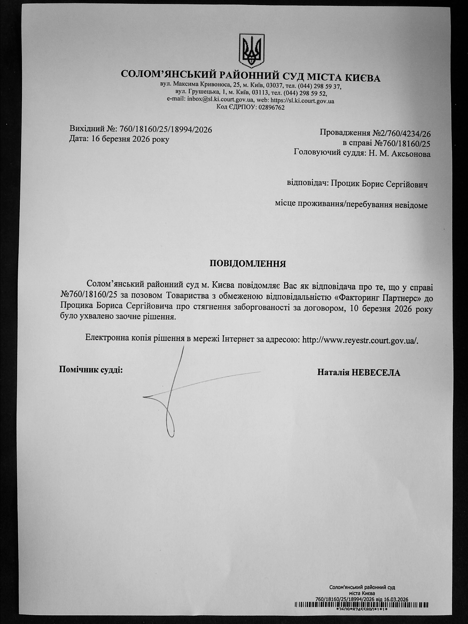 Оголошення про виклик до суду про справі 760/18160/25 Процик Б.С