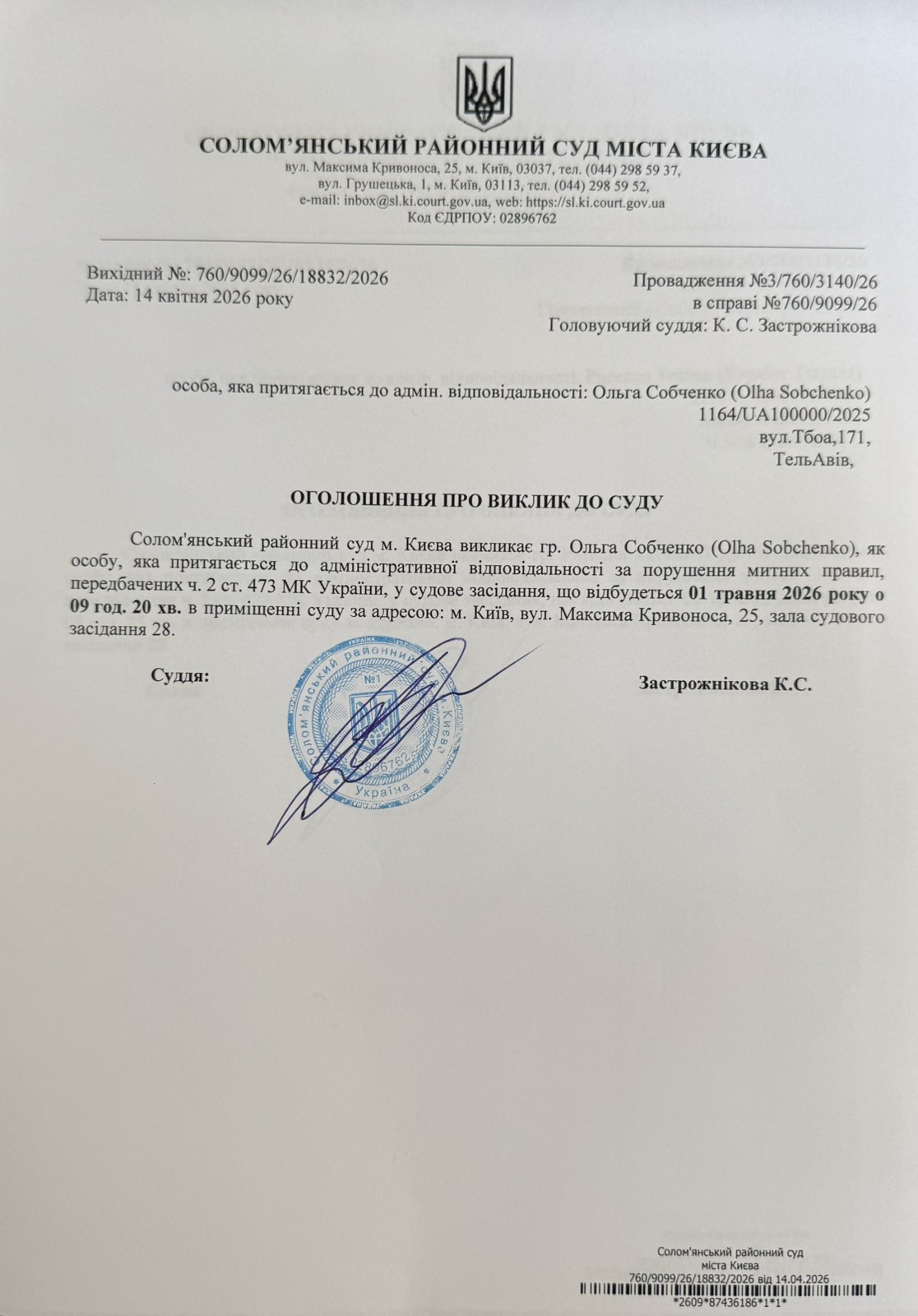 Оголошення про виклик до суду про справі 760/9099/26 Ольга Собченко