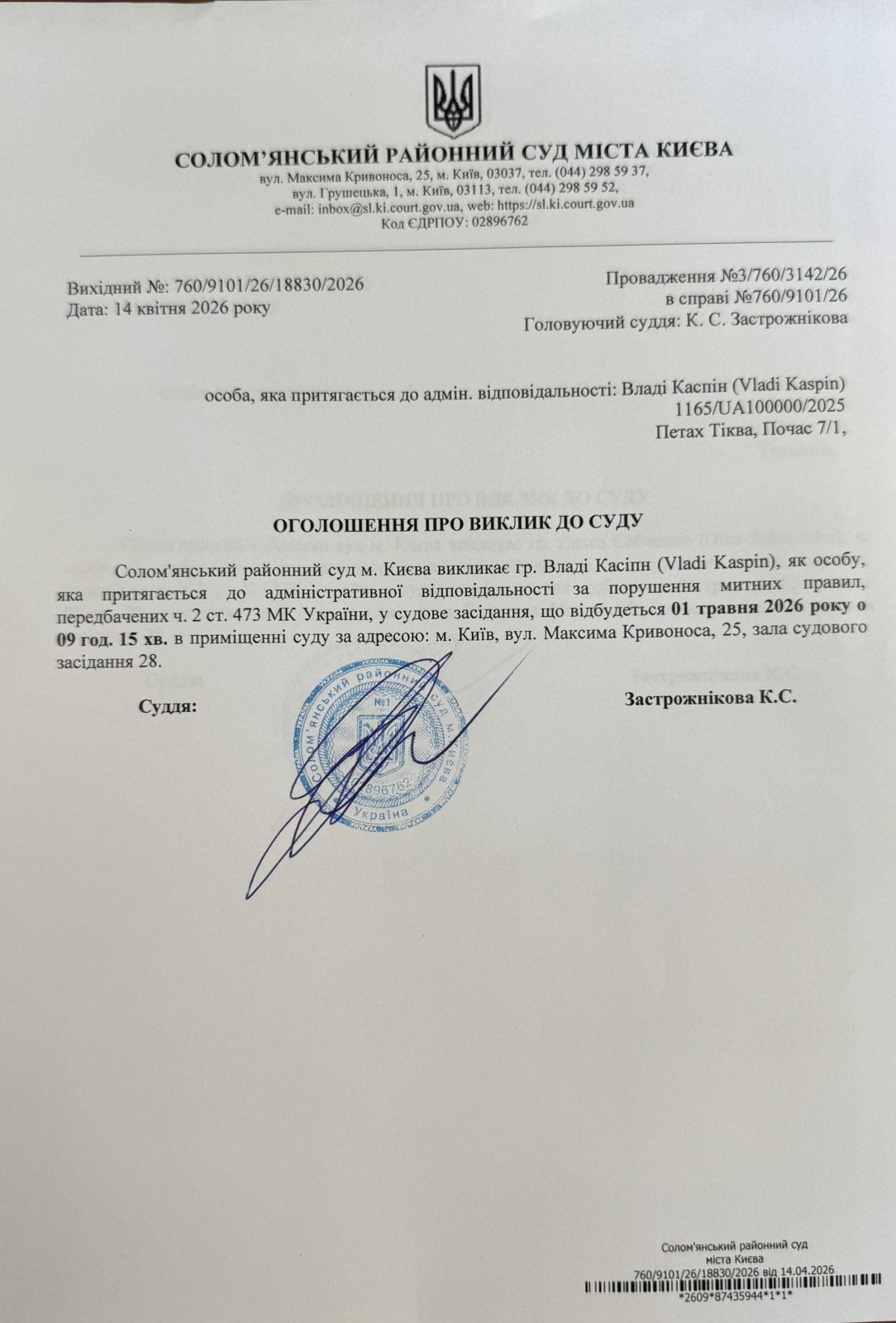 Оголошення про виклик до суду про справі 760/9101/26 Владі Каспін
