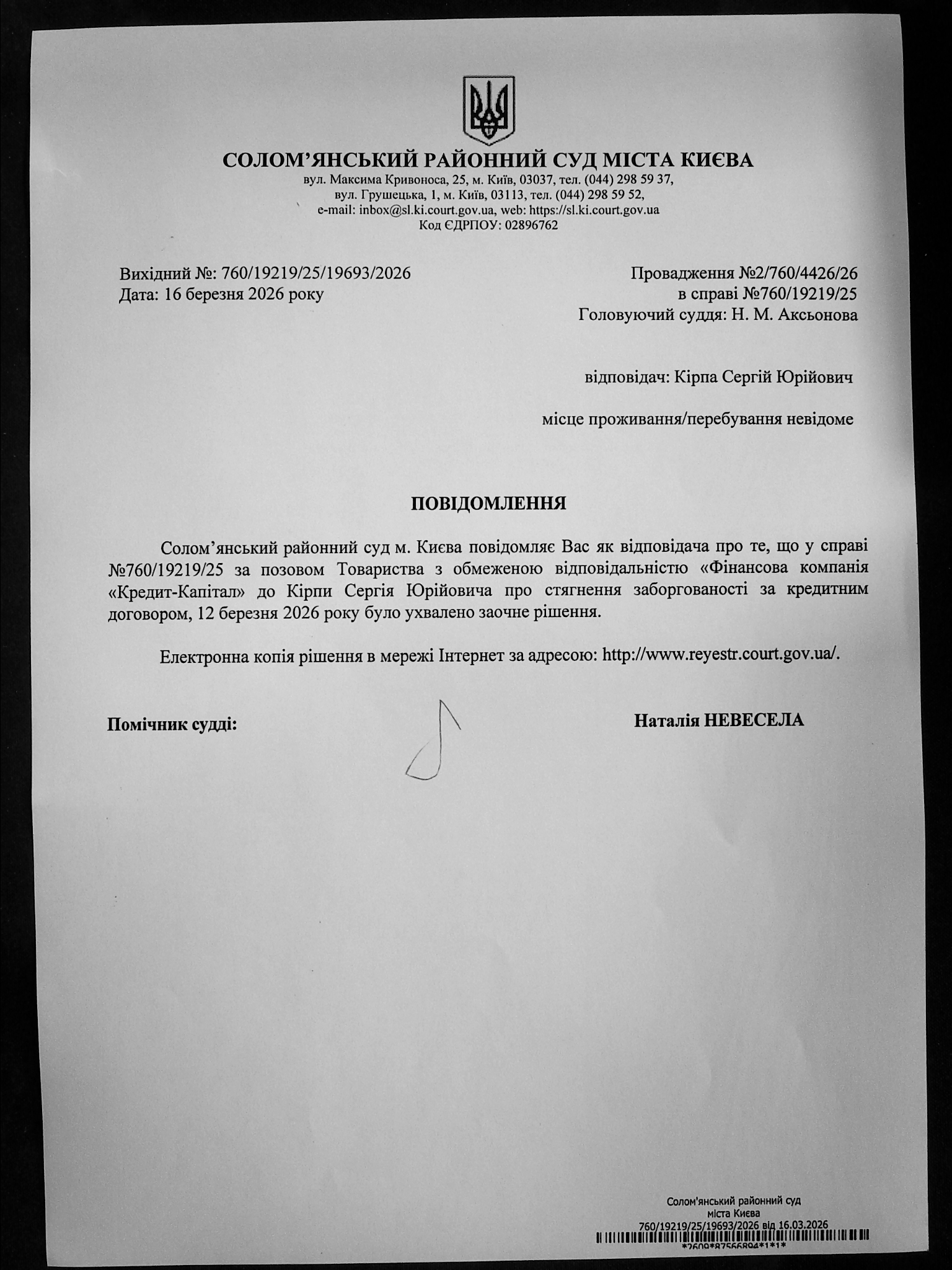 Оголошення про виклик до суду про справі 760/19219/25 Кірпа С.Ю.