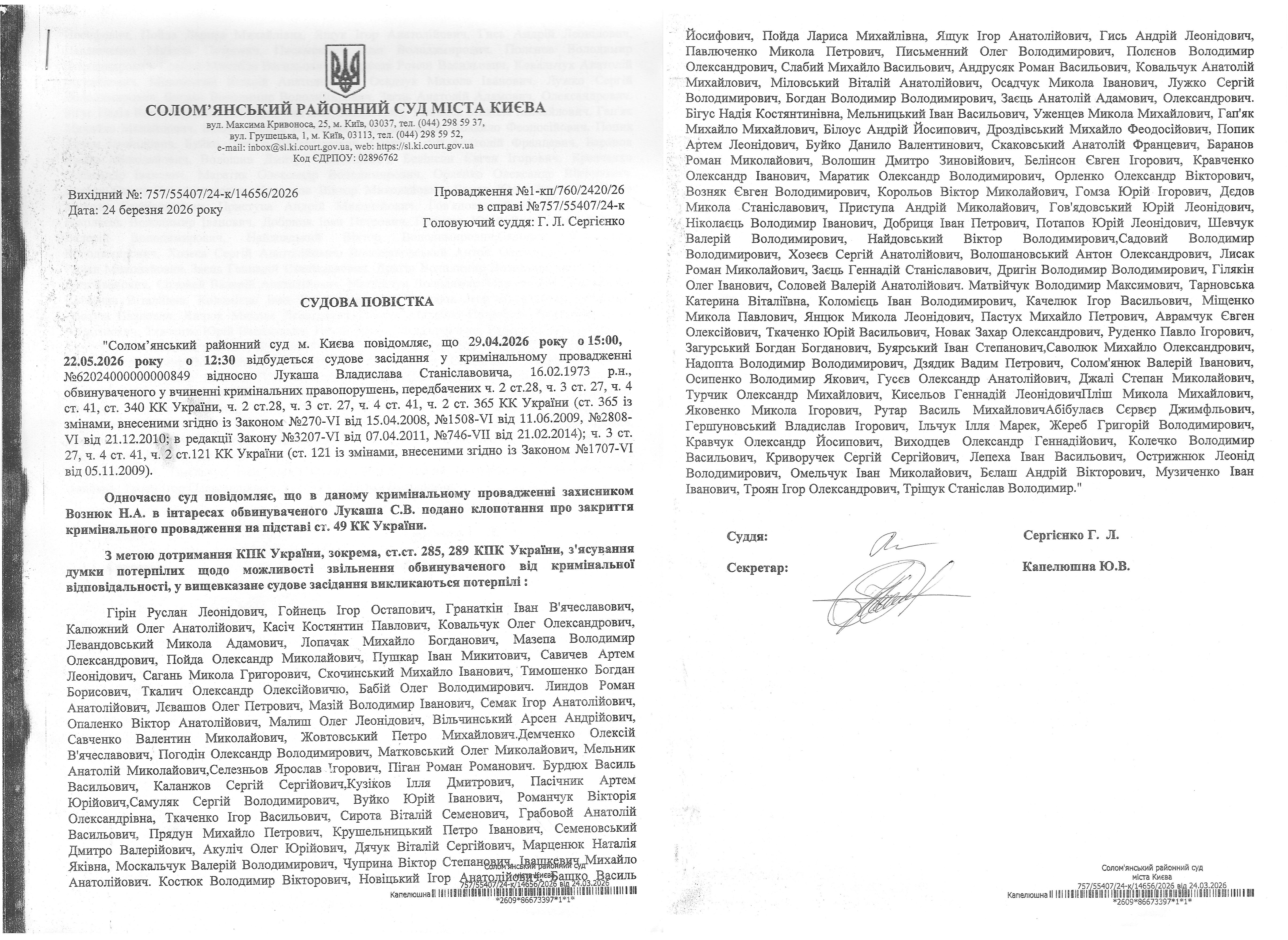 Оголошення про виклик до суду про справі 760/55407/24-к Лукаш В.С.
